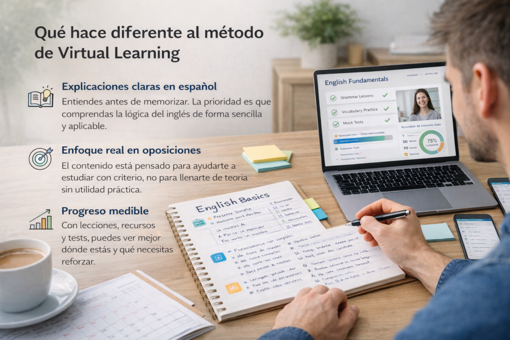En Virtual Learning te ayudamos a estudiar el inglés que realmente te sirve para oposiciones. Empiezas con una base clara, practicas con estructura y avanzas con una metodología diseñada para opositores españoles que quieren progresar sin perder tiempo en contenido innecesario.